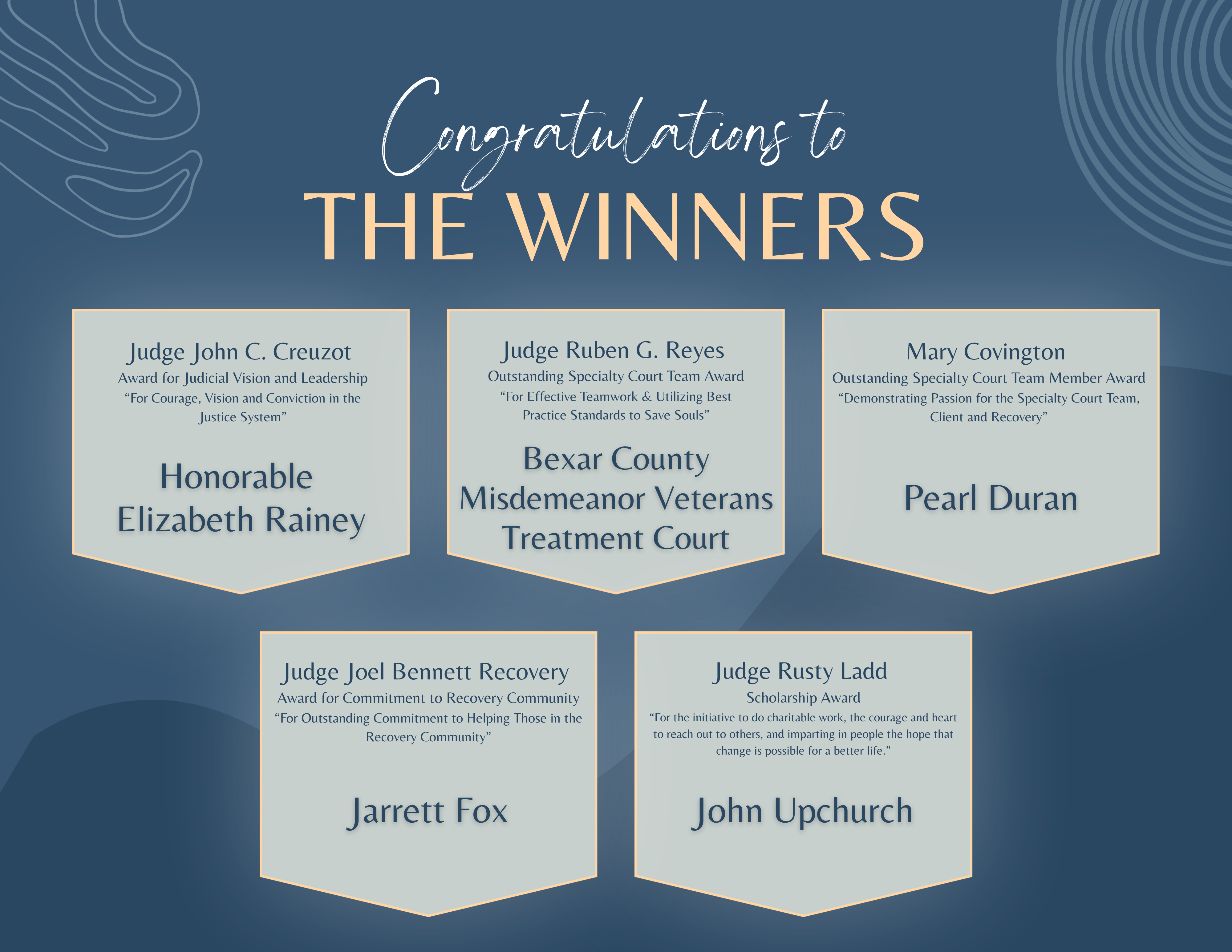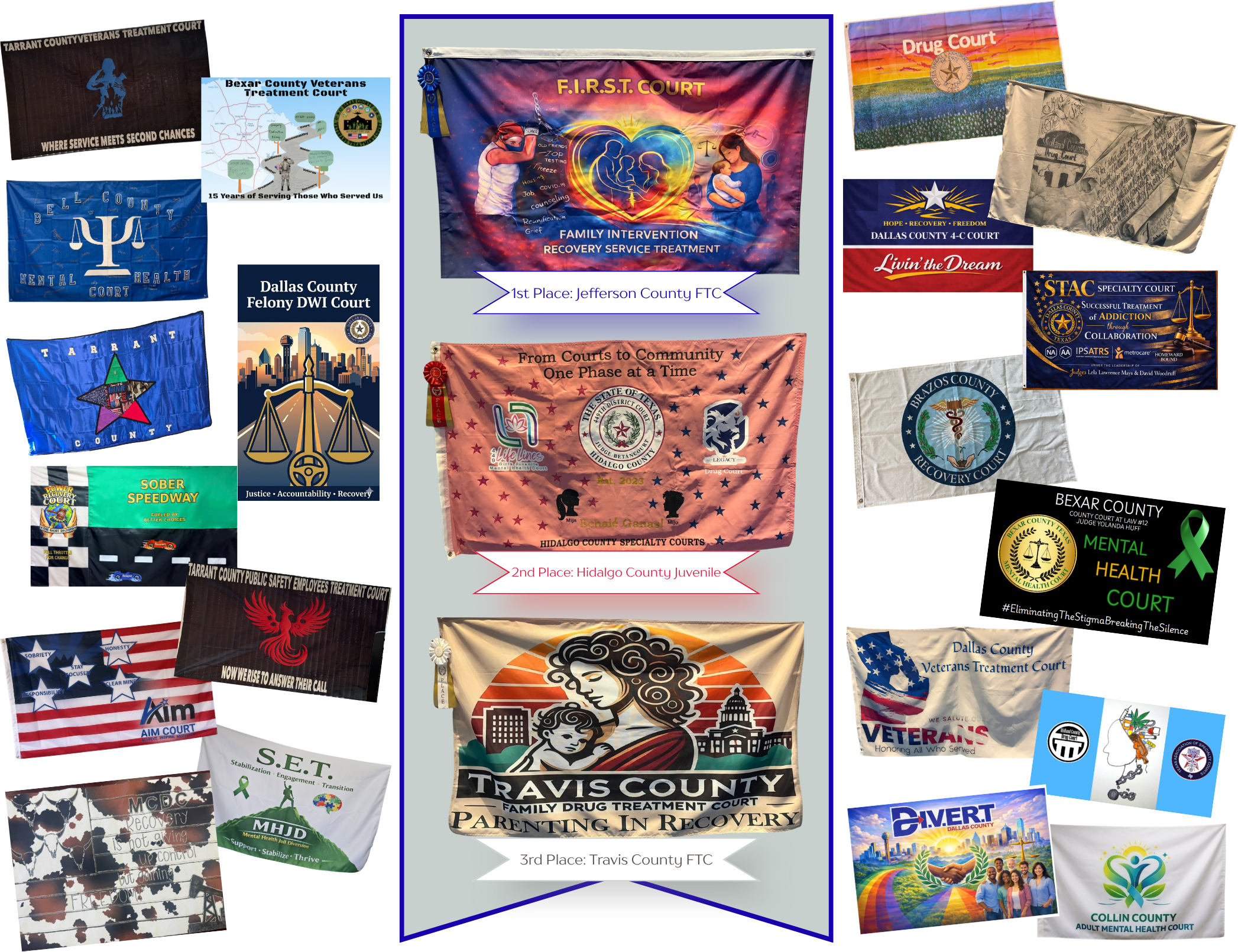 So many of our fantastic specialty courts were represented in Dallas in March as the Texas Association of Specialty Courts held their annual training conference. Close to 700 professionals gathered to network, fill their toolboxes with new tools, and reinvigorate their passion for this work. The record number of attendees was reflected in the highest number of submissions for the annual conference contest ever. 23 teams created and submitted entries for the flag contest, which were voted on by attendees. The flags were submitted with a written description of the meaning of the design and how it reflected their program. The thoughtfulness displayed was truly impressive. Take a look at all the entries a well as the award winners that were recognized at the conference!!
