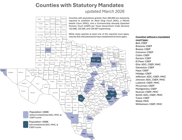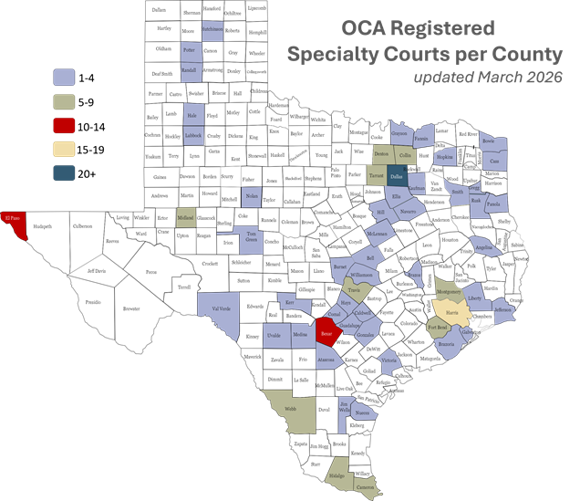 There are currently 209 registered Specialty Courts in Texas. The graphics below highlight the number of courts by type, the number of courts by county, and the counties with statutory mandates for specialty courts. (updated 1/5/2026).